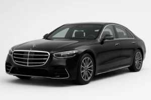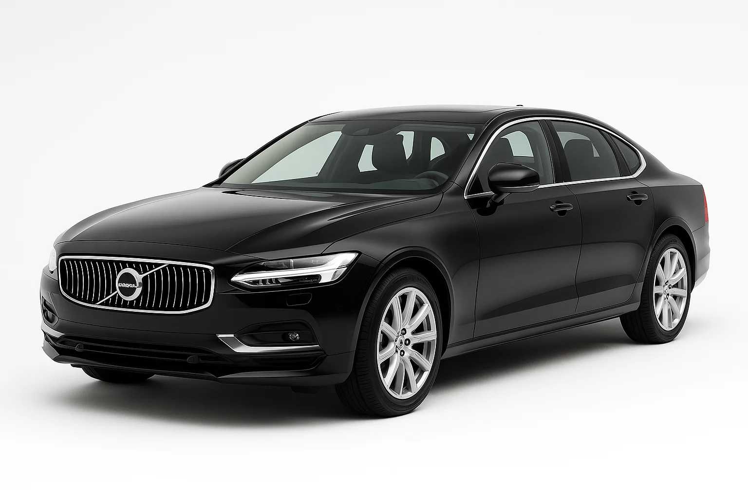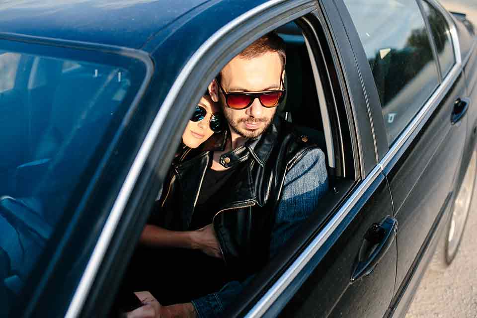 Handsome young man in full suit talking on smart phone and smiling while sitting in the car